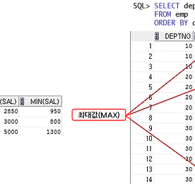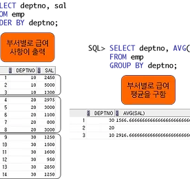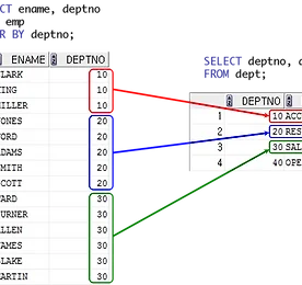 Oracle/Oracle Programming 썸네일형 리스트형 [Oracle] NON-EQUI JOIN ■ NON-EQUI JOIN -. NON-EQUI JOIN은 조인 조건에 특정 범위 내에 있는지를 조사하기 위해서 WHERE 절에 조인 조건을 = 연산자 이외의 비교 연산자를 사용 ① 등급 테이블(salgrade)의 구조SQL> SELECT * FROM salgrade; 구조) -. 급여의 등급은 총 5등급으로 나누어져 있다. -. 1등급은 급여가 700부터 1200사이, 2등급은 급여가 1201부터 1400 사이, 3등급은 급여가 1401부터 2000 사이, 4등급은 급여가 2001부터 3000 사이, 5등급은 급여가 3001부터 9999 사이 ② salgrade 테이블에서 정보를 얻어와 각 사원의 급여 등급을 살펴보는 예제 SQL> SELECT e.ename, e.sal, s.grade FROM em.. 더보기 [Oracle] EQUI JOIN ■ EQUI JOIN -. EQUI JOIN은 가장 많이 사용하는 조인 방법으로 조인 대상이 되는 두 테이블에서 공통적으로 존재하는 컬럼의 일치되는 행을 연결하여 결과를 생성하는 조인 방법이다. ① 사원들의 소속 부서를 출력하기 위해서 두 개의 테이블을 조인한 경우SQL> SELECT * FROM emp, dept WHERE emp.deptno = dept.deptno; 풀이) -. 사원(emp) 테이블과 부서(dept) 테이블의 고통 컬럼인 deptno의 값이 일치(=)되는 조건을 WHERE절에 기술하여 사용 -. 두 테이블을 조인하려면 일치되는 공통 컬럼을 사용해야 한다. -. 컬럼의 이름이 같게 되면 혼돈이 오기 때문에 컬럼명 앞에 테이블 명을 기술한다. -. 조인문은 특별한 키워드 없이 SELEC.. 더보기 [Oracle] 조인의 기본 개념 ■ 조인의 기본 개념 -. 조인은 두 개 이상의 테이블을 결합해야만 원하는 결과를 얻을 수 있을 때 사용한다. ※ 조인을 필요로 하는 예 -. 특정 사원에 대한 부서명을 알아내기 위해서는 부서 테이블에서 정보를 얻어와야 하므로 두 테이블을 조인하여 원하는 데이터인 부서명을 얻어와야 한다. 01. 조인을 사용하지 않은 경우 SQL> SELECT ename, deptno FROM emp ORDER BY deptno; SQL> SELECT deptno, dname FROM dept; 02. 조인을 사용한 경우 SQL> SELECT ename, dname, emp.deptno, dept.deptno FROM emp, dept WHERE emp.deptno = dept.deptno; ※ 사원 번호가 7900번인 .. 더보기 [Oracle] HAVING 절 ■ HAVING 절 -. WHERE절이 SELECT문에서 조건 검색을 위해서 사용한다면 HAVING절은 GROUP BY 절에 의해 생성된 결과 값 중 원하는 조건에 부합하는 자료만 보고자 할 때 사용한다. ① 부서별로 평균을 구하되 나온 결과 값중에서 그 평균값이 2000 이상인 자료만 산출하는 예SQL> SELECT deptno, AVG(sal) FROM emp GROUP BY deptno HAVING AVG(sal) >= 2000; ② HAVING 절을 WHERE 절과 함께 사용하는 예제 -. 테이블에서 100 이상의 급여를 가지고 있는 사람들에 대해서만 부서별로 평균을 구한 후 구해진 부서별 평균 급여가 2000 이상인 부서 번호와 부서별 평균 급여를 출력한다.SQL> SELECT deptno, A.. 더보기 [Oracle] GROUP BY 절 ■ GROUP BY 절 -. GROUP BY 절은 최대 값이나, 최소 값, 합계, 평균 등을 어떤 컬럼을 기준으로 그 컬럼의 값별로 보고자 하는 경우 사용한다. -. 그룹함수를 쓰되 어떤 컬럼 값을 기준으로 그룹 함수를 적용해 줄지 기술해 주어야 하는데 GROUP BY절 뒤에 해당 컬럼을 기술하면 된다. SELECT 컬럼명 별칭, FROM 테이블명 WHERE 조건(연산자) GROUP BY 컬럼명; -. GROUP BY 절을 사용할 때 주의할 점은 GROUP BY절 다음에는 컬럼의 별칭을 사용할 수 없고, 반드시 컬럼명을 기술해야 한다는 점이다. -. 사원 테이블에서 부서별로 평균 급여를 구하려면 우선 전체 사원을 부서별로 그룹핑을 해야 한다. ① 소속 부서별 평균 급여를 구하는 예제SQL> SELECT .. 더보기 이전 1 2 3 4 5 6 7 다음