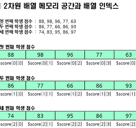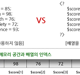 ■ 1차원 배열 다섯 과목(국어, 영어, 수학, 사회, 과학) 점수의 합계와 평균을 구하는 프로그램을 생가해 보자. 만약 배열을 사용하지 않으면, 왼쪽과 같이 각 과목들에 해당하는 변수를 정의하고 점수를 입력해야 한다. 반면에 오른쪽과 같이 배열을 사용해 프로그램을 작성하면, 여러개의 변수를 사용하는 대신 하나의 배열 변수 $score를 사용해 쉽고 효율적으로 프로그래밍할 수 있다. 위와 같이 배열 변수 $score는 다섯 개의 원소를 가지며 각각의 위치는 $score[0], $score[1], $score[2], $score[3], $score[4]가 된다. [ ]안에 있는 숫자를 배열의 인덱스라고 부르는데, 인덱스의 값이 0부터 시작된다는 점에 유의한다. 이처럼 배열을 이용하면 한꺼번에 여러 개의 변..