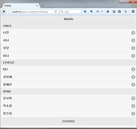 jQuery 썸네일형 리스트형 [jQueyrMobile] 리스트 구분자 사용 및 그룹화 ■ jQueyr Mobile 리스트 구분자 jQuery Mobile에서는 ul 태그나 ol 태그 같은 리스트 태그의 data-role 속성을 listview로 입력하면 스마트폰의 리스트와 같은 모습으로 바꿀 수 있다. 그리고 리스트 안에는 리스트의 요소를 구분할 구분자 라는 것이 있는데. jQuery Mobile에서 구분자를 만들려면 li 태그의 jQuery Mobile 속성값을 list-divider로 입력하면 바꿀 수 있다. 01. list-divider 구분자를 사용하여 리스트를 구분하기 위한 코드는 아래와 같다. list_drivider.php Mobile TWICE 나연 사나 모모 미나 LOVELIZ KEI 유지애 정예인 APINK 윤보미 박초롱 정은지 FOOTER 02. 위에서 생성한 파일을 .. 더보기 [jQueyrMobile] 다이얼로그(알림) 창 띄우기 ■ jQueyr Mobile 다이얼로그(알림) 창 띄우기 jQuery Mobile에서 data-rel 속성에 dialog를 입력하면 다이얼로그 형태로 페이지가 전환된다. 이 경우에도 data-transition 속성을 사용하여 슬라이드 애니메이션 효과를 줄수 있다. 01. data-rel을 이용한 다이얼로그 창 뜨위기 코드는 아래와 같다. inside_move_data_rel.php Mobile DIALOG SLIDE DIALOG POP DIALOG SLIDEDOWN DIALOG FLIP FOOTER Other Page Lorem ipsum dolor sit amet FOOTER 02. 위 코드를 브라우저 상에서 실행시키면 아래와 같은 화면이 나타나고 하나의 열을 선택하고 나면 03. 그럼 아래와 같이 .. 더보기 [jQueyrMobile] 페이지 이동간 슬라이드 애니메이션 ■ jQueyr Mobile 페이지 이동간 슬라이드 애니메이션 jQuery Mobile은 기본적으로 왼쪽 슬라이드 방식으로 페이지간 이동이 이루어지지만. data-transition 속성 값을지정함으로서 슬라이드 애니메이션을 교체할 수 있다. slide · 기본값이 되는 왼쪽 슬라이드 애니메이션 · data-transition을 지정하지 않아도 해당 방식으로 전환된다. slideup · 다음 페이지가 화면 아래에서 위로 올라온다. slidedown · 다음 페이지가 화면 위에서 아래로 내려온다. pop · 다음페이지가 가운데서 부터 커지면서 전환된다. fade · 첫번째 페이지가 흐려지면서 다음 페이지로 전환된다. flip · 첫번째 페이지가 뒤집히면서 다음페이지로 전환된다. 01. data-transi.. 더보기 [jQueryMobile] 내부 페이지 이동 및 Back 버튼 추가 ■ jQueyr Mobile 내부 페이지 이동 jQueyr Mobile에서 페이지를 이동하려면 여러개의 페이지를 생성하고 a 태그의 href 속성에 이동할 페이지의 id를 입력해야 한다. 01. 페이지 이동을 위한 예제 코드는 아래와 같다. inside_move.php Mobile List Item 1 List Item 2 List Item 3 List Item 4 List Item 5 FOOTER Other Page Lorem ipsum dolor sit amet FOOTER 02. 그럼 아래와 같은 출력 결과에서 하나의 행을 클릭하면 03. 다음 행으로 이동한 모습을 확인 할 수 있다. ■ jQueyr Mobile 내부 페이지 Back 버튼 생성 jQuery Mobile에서 아이폰처럼 뒤로 가기 버튼.. 더보기 [jQueryMobile] jQuery Mobile 설정하기. ■ jQuery Mobile 설정하기. 01. jQuery Mobile(http://jquerymobile.com) 사이트에 접속하여 상단 메뉴에서 Download를 클릭한다. 02. 사용할 버전을 선택하고 Zip File을 다운받는다. ① 포스트 작성일 기준 가장 최신의 버전의 jquery.mobile-1.4.5.zip 파일을 클릭한다. ② 다운로드 창이 뜨면 확인을 눌러 jquery.mobile-1.4.5.zip 파일을 다운받는다. 03. 다운받은 jquery.mobile-1.4.5.zip 파일의 압축 해제한다. 04. 압축을 해제한 jquery.mobile-1.4.5 폴더에서 *.css 파일을 따로 빼내두자. ① jquery.mobile-1.4.5.css, jquery.mobile-1.4.5.min.. 더보기 이전 1 2 3 4 5 6 7 8 ··· 21 다음
